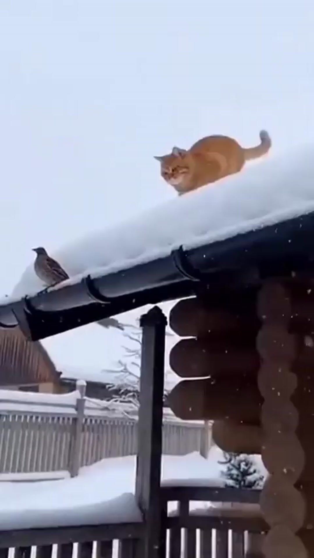 On the edge of the roof, the cat was lurking with a completely professional look