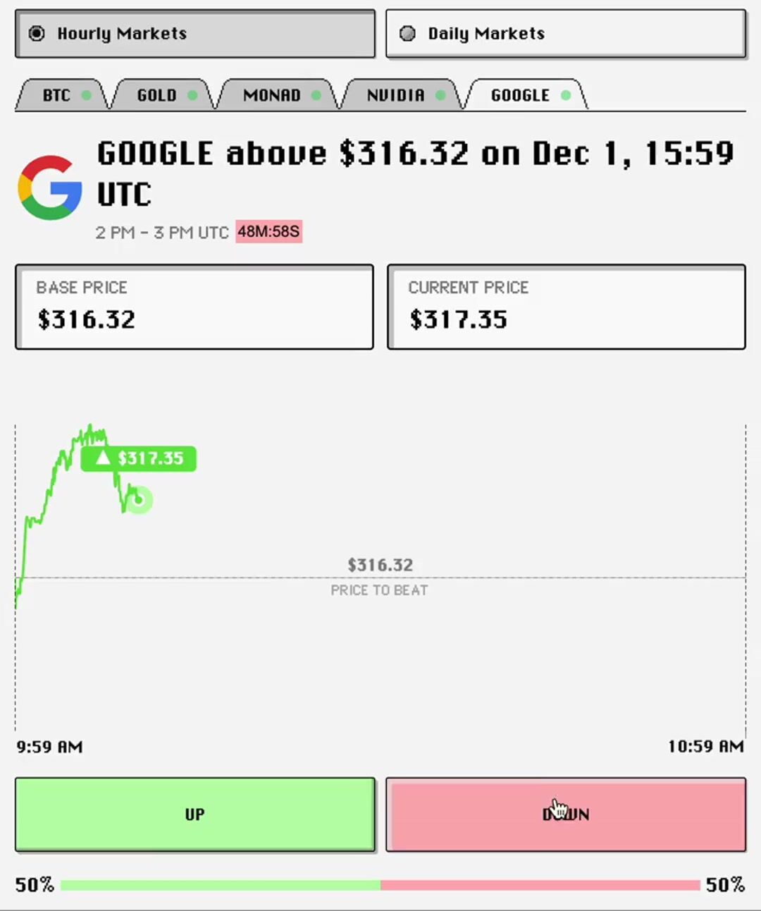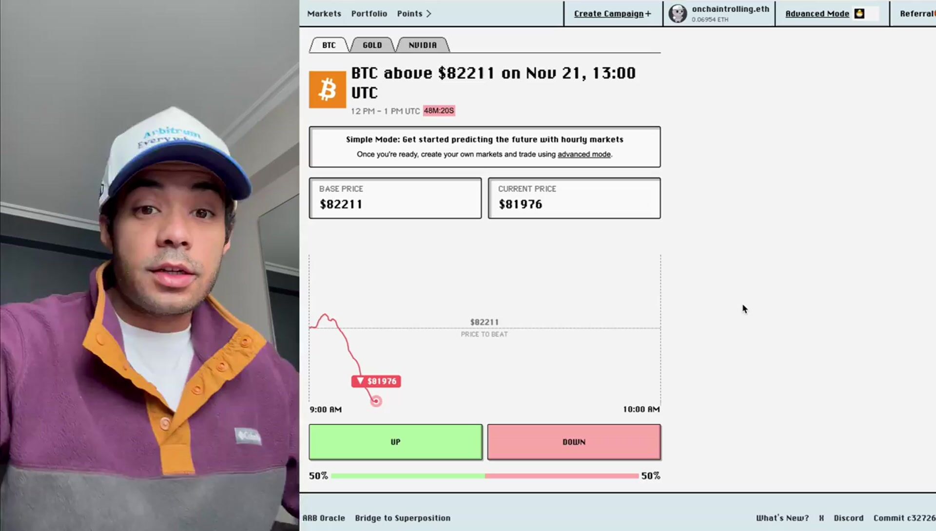 place 1-hour predictions on BTC/Gold/NVIDIA on arbitrum