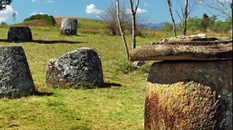 The Plain of Jars is a collection of large stone jars interspersed throughout the Xieng Khouang plain in the Lao Highlands. The stone structures are mostly made of sedimentary rock and, ranging from 3 to 10 feet in height (1 to 3 meters), each can weigh up to 14 tons.