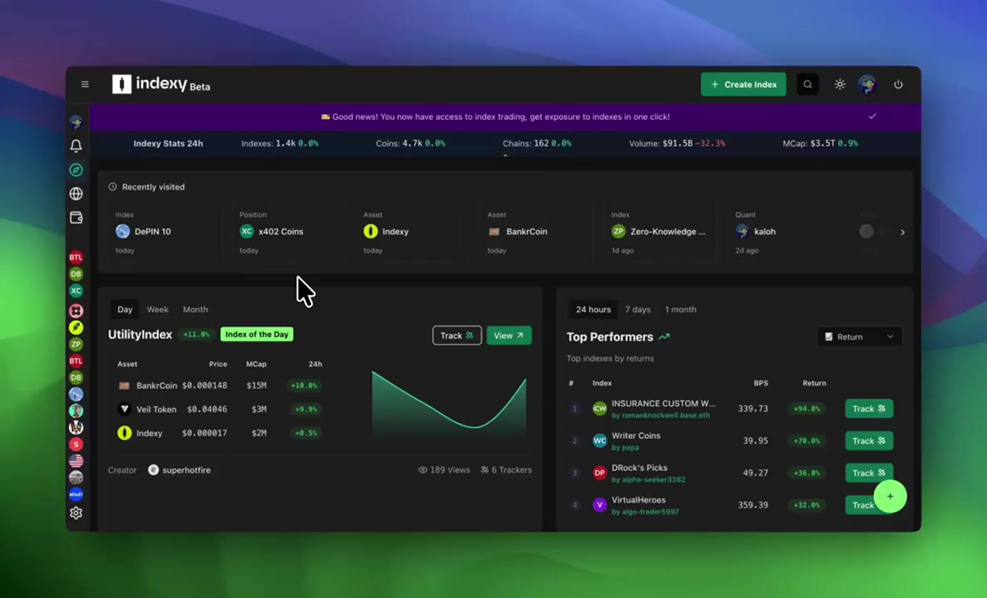 - New navigation to easily find your indexes, tracked indexes and assets, and your positions*