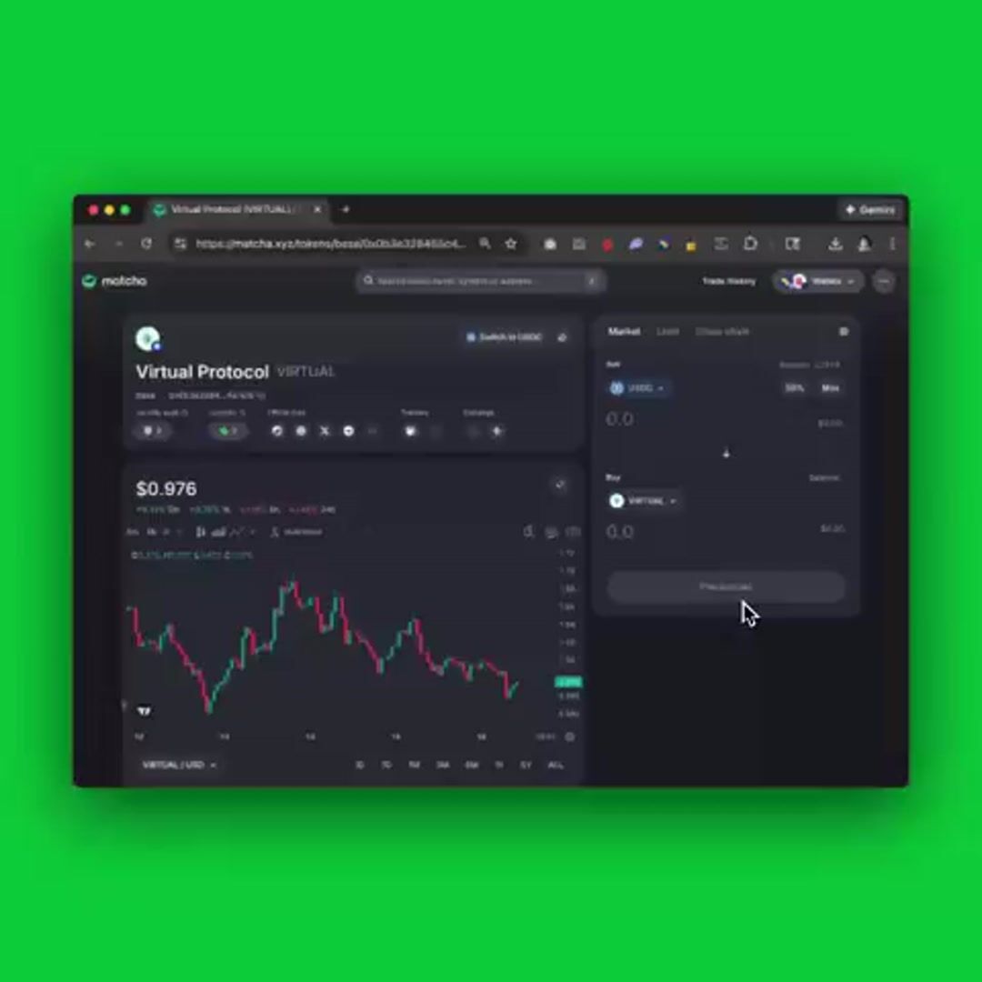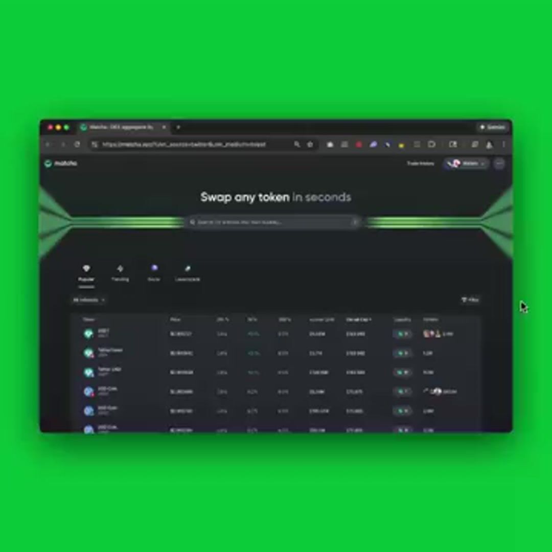 DEX aggregator by 0x. Search and trade over 27 million tokens across 180+ DEXs and 15 chains. It happens on matcha.xyz and the Matcha Mini App.