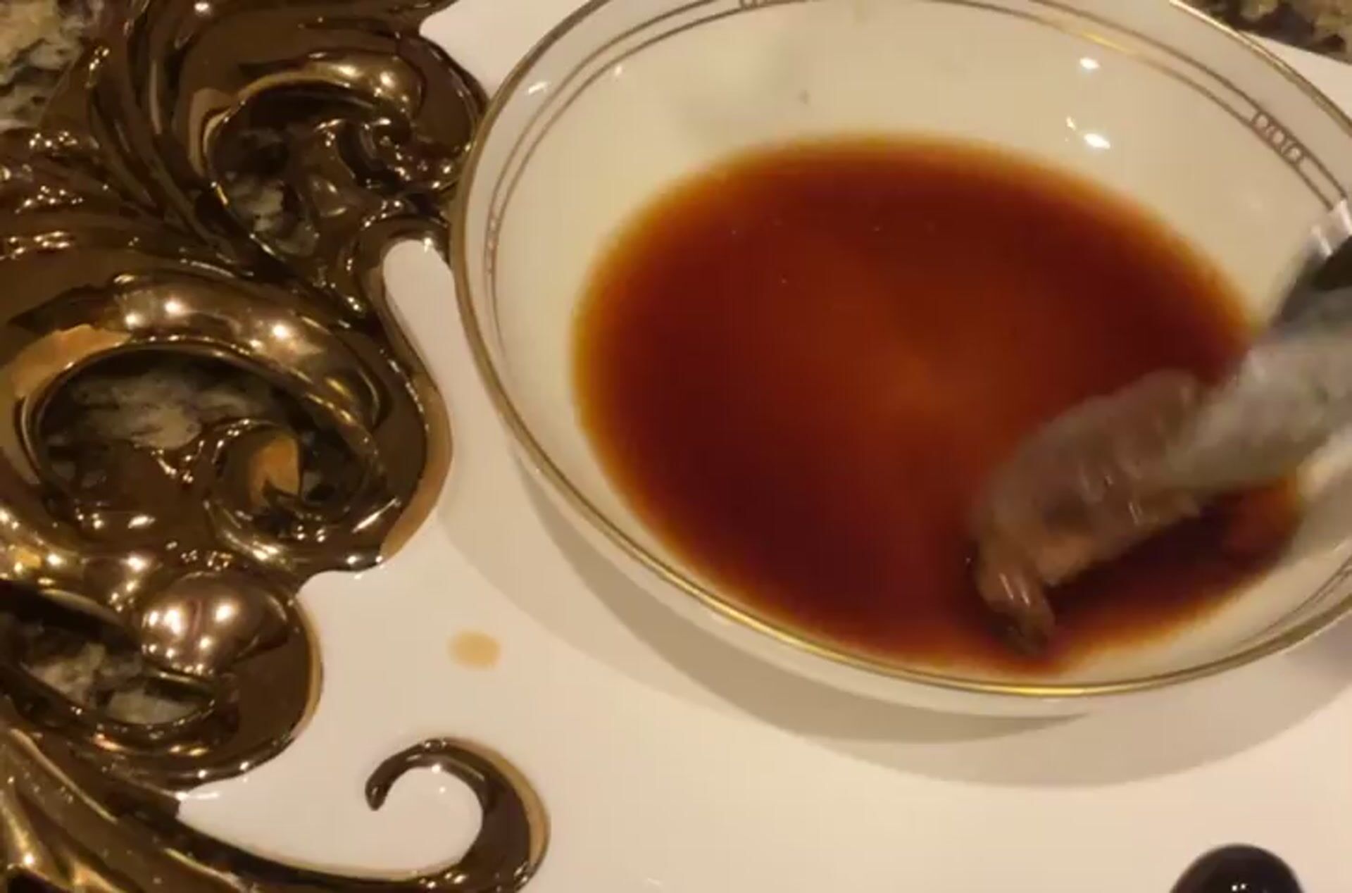 That sauce is Worcestershire. The sauce on the plate is truffle balsamic glaze.
