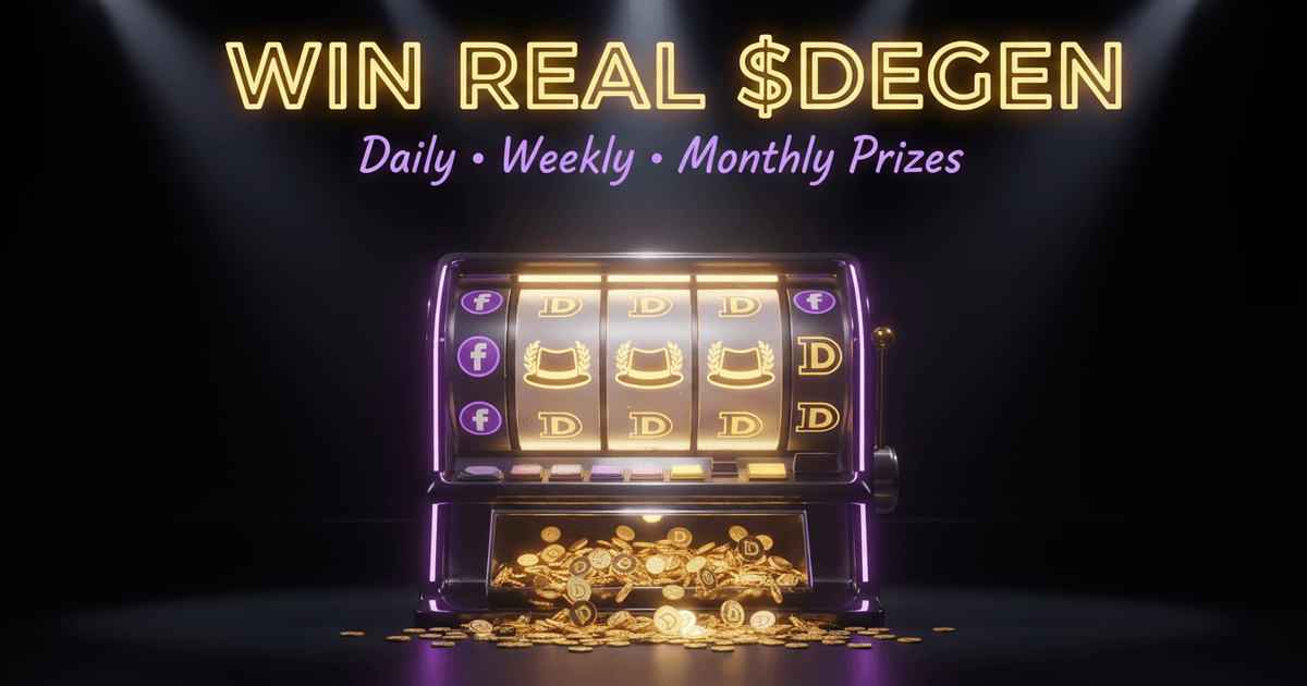 Description: Spin 5 reels with Farcaster symbols. Free Spins, Bonuses, and Progressive Jackpot. Win real DEGEN prizes daily, weekly, and monthly. Prizes auto-sent to your Base wallet.
