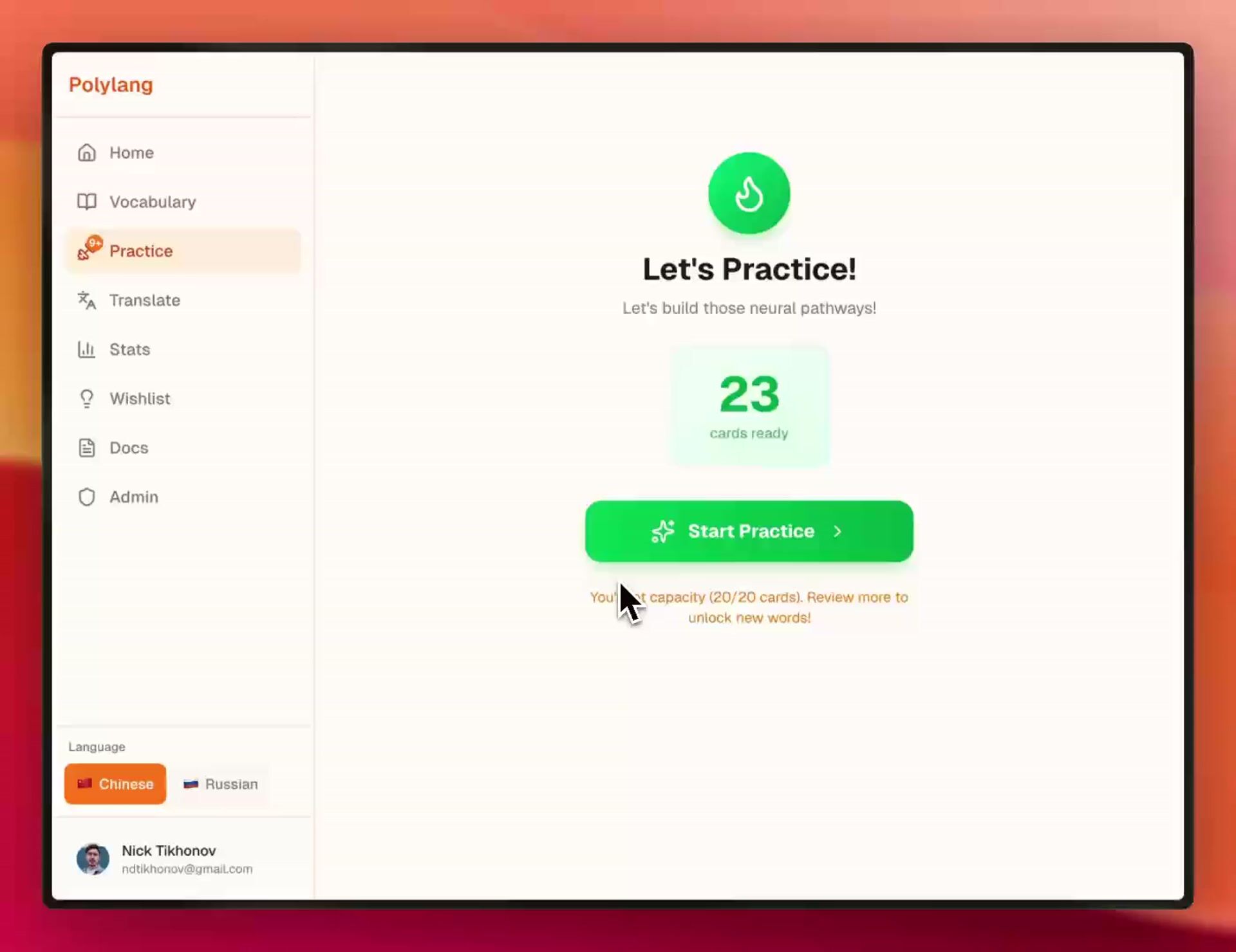 here's the app I've built to help me learn 60 new Chinese words every week. included: generate rich media flashcards, spaced repetition, AI sentence translation and a lot of nerdy stats (including a model of your memory!)