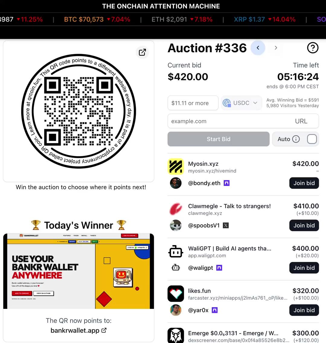 @bondy.eth leads todays auction with a $420 bid trying to point the $QR to the myosin.xyz site