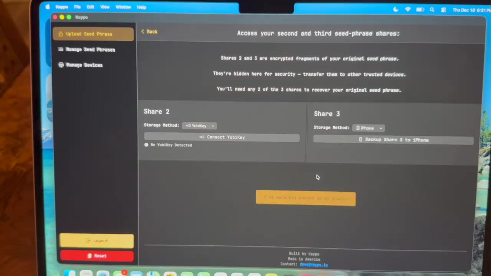 Your seed phrase is split into pieces and stored on devices you already own. You can't access each piece without biometric auth or pin.
