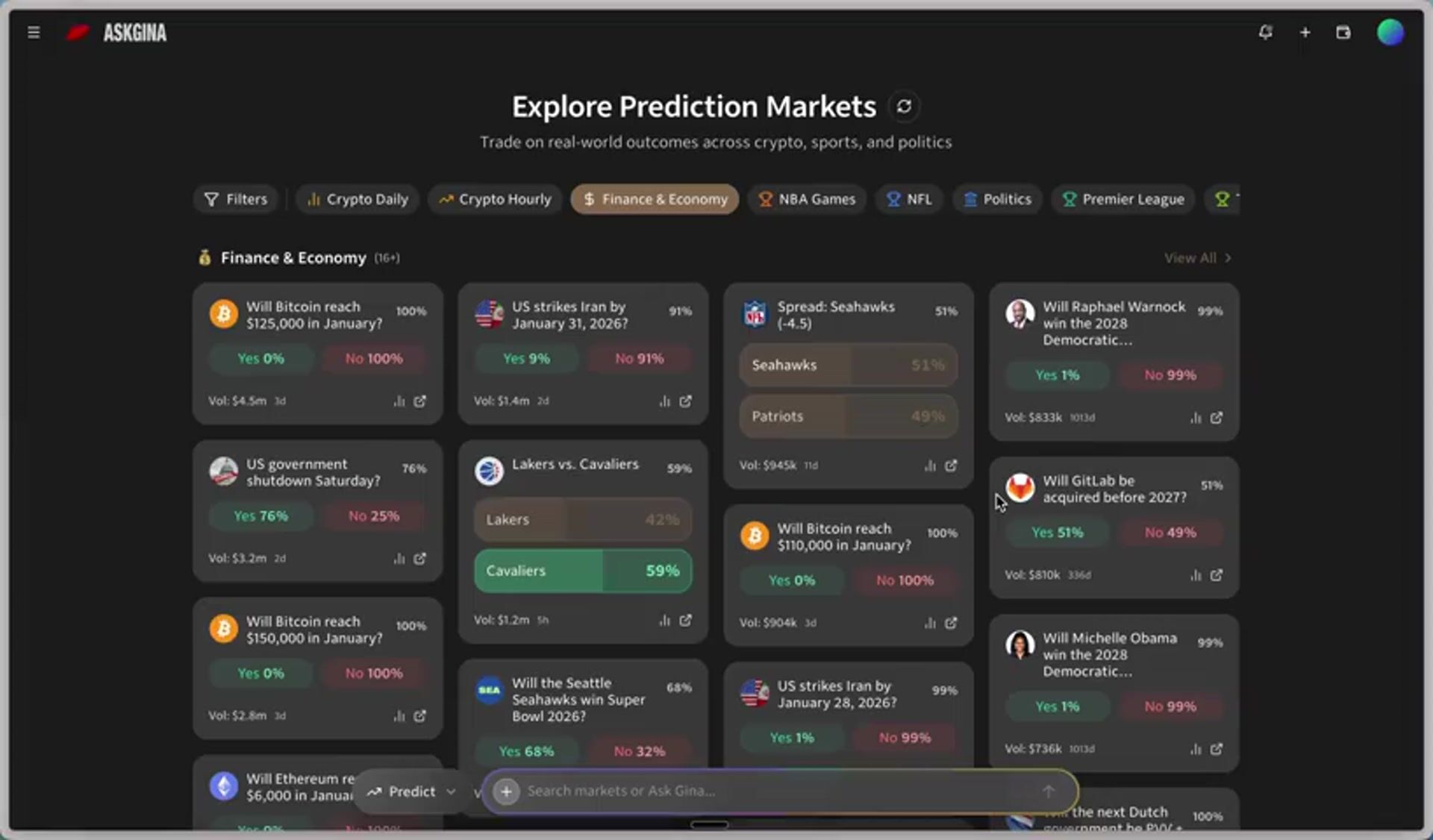 you can now filter across related markets, sort by outcome probability, time to expiry and a lot more now with just a prompt to Gina in app.