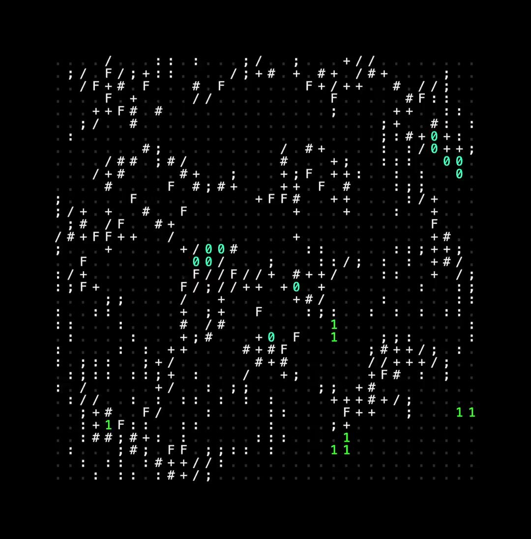A minimalist, custom artificial life system visualized as a grid of text. Agents are wondering around, exploring the space, while maintaining proximity to one another. The coloured cha...