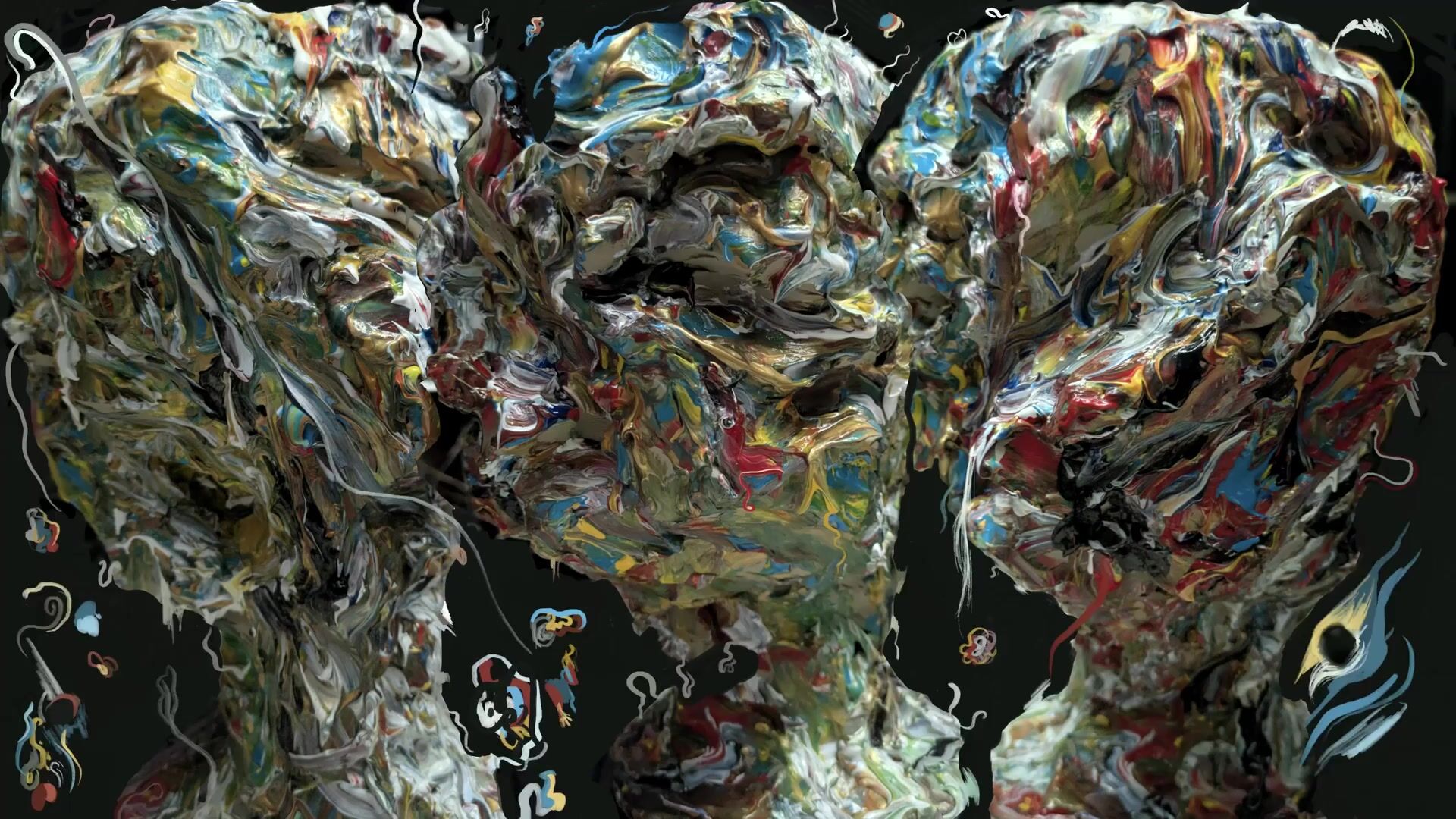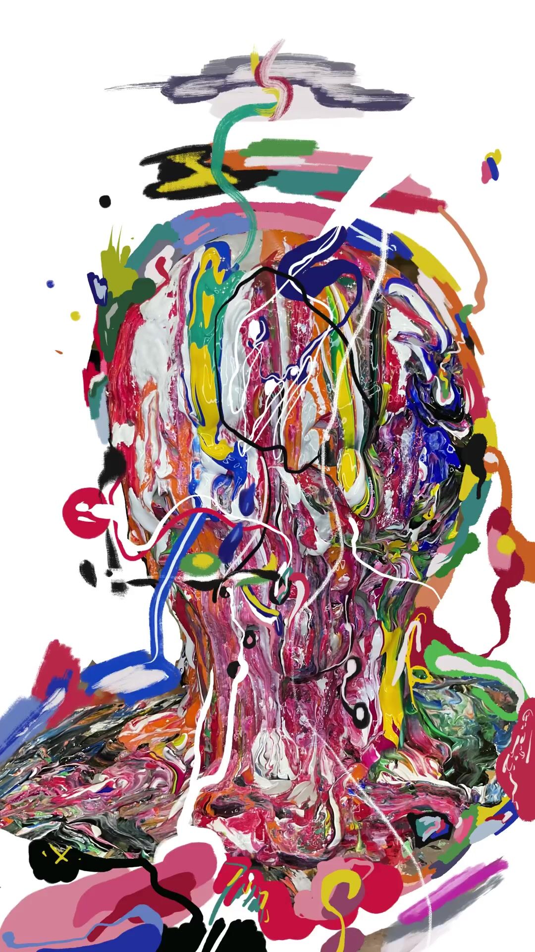 The face no longer holds. The colors (raw emotions) flow, sorted by digital gravity....