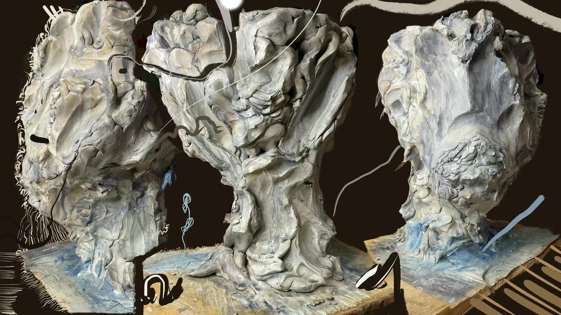 Mixed media: Raw clay + Wood, acrylic, digital animation